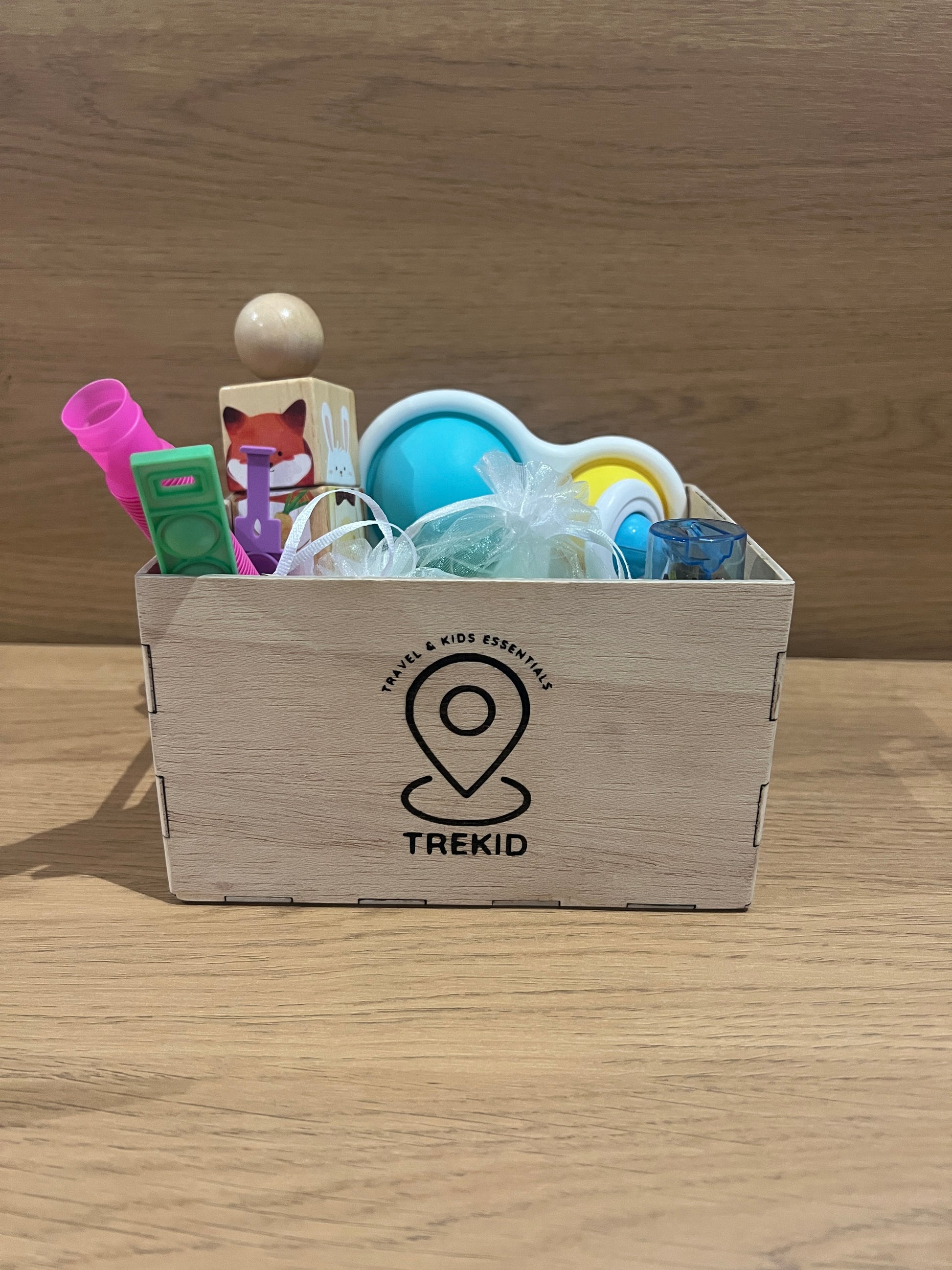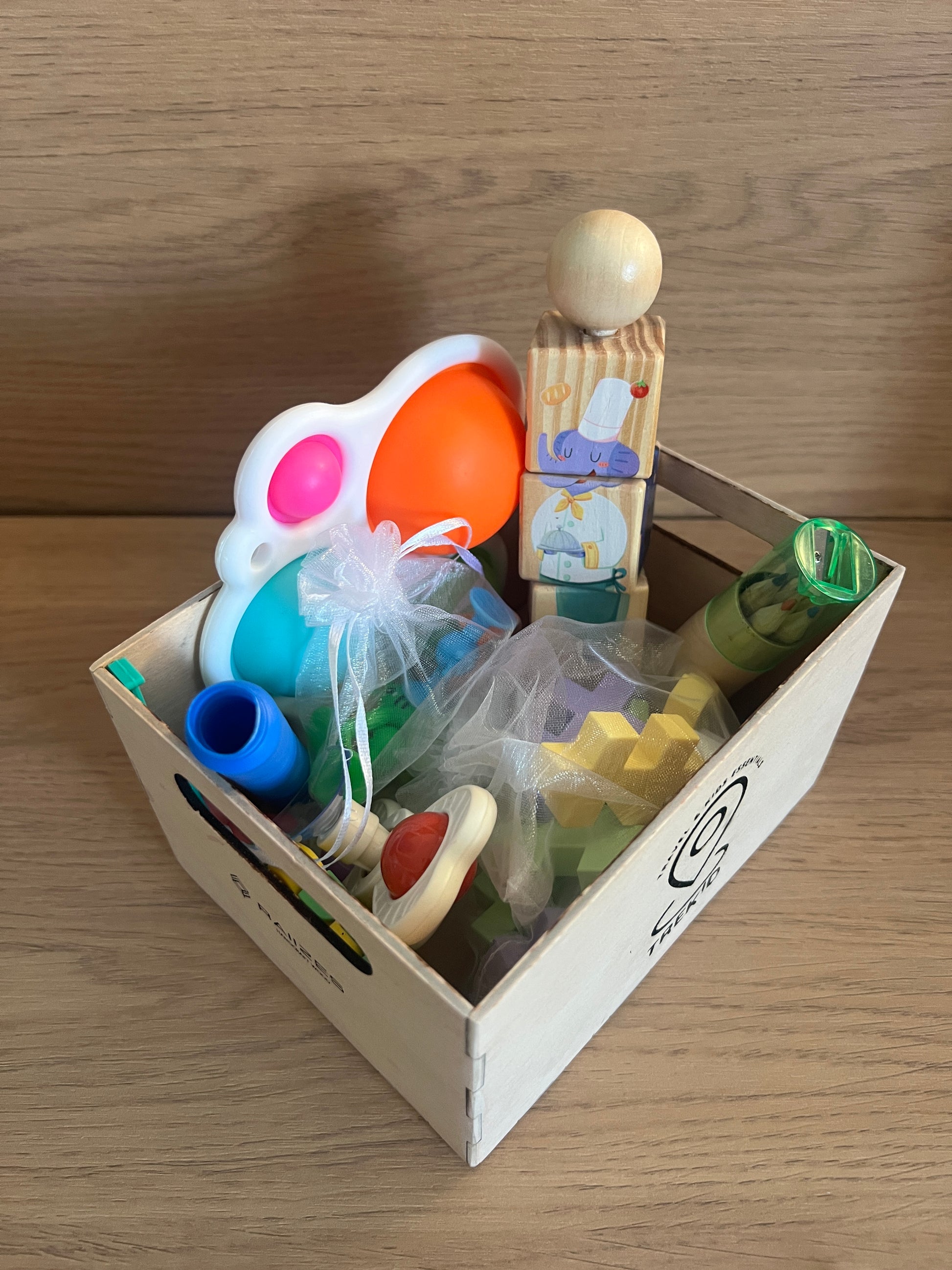Dentro da caixa encontras uma seleção de brinquedos reutilizáveis, duradouros e sensoriais, que estimulam a criatividade, a concentração e a imaginação das crianças, sem depender de tecnologia: